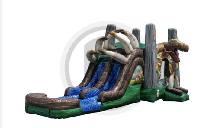 The Dual Lane Dino Combo delivers double the excitement. This dual-lane wet or dry combo combines a spacious bounce house, twin slides, and a built-in basketball goal for nonstop action. Bright dinosaur graphics catch the eye. Durable construction holds up to energetic play. Perfect for backyard parties, community events, and rentals that need crowd-pleasing variety. 🏰🏀